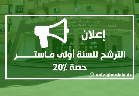 تنهي نيابة المديرية للدراسات الى علم جميع الراغبين في الترشح للالتحاق بالسنة الأولى ماستر برسم السنة الجامعية 2025/2024، عن انطلاق عملية الترشح لفئة 20% والتي تشمل الحاصلين على شهادة الليسانسLMD :